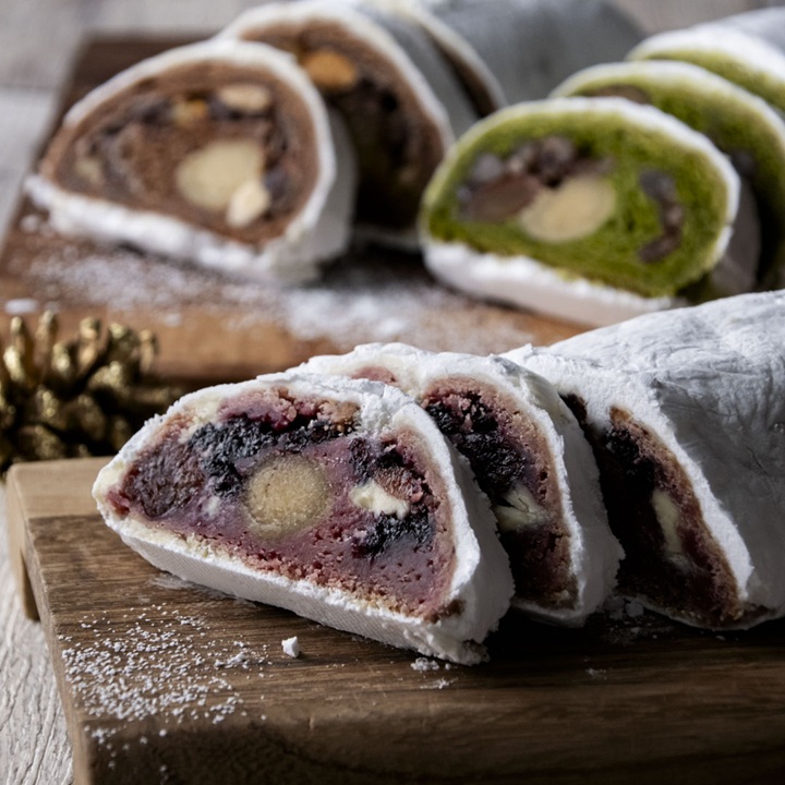 宇治抹茶の豊かな香りと鮮やかなグリーン、わずかにラム酒が香るマロンの上品な甘み、赤エンドウの塩気を合わせた和のシュトーレン。