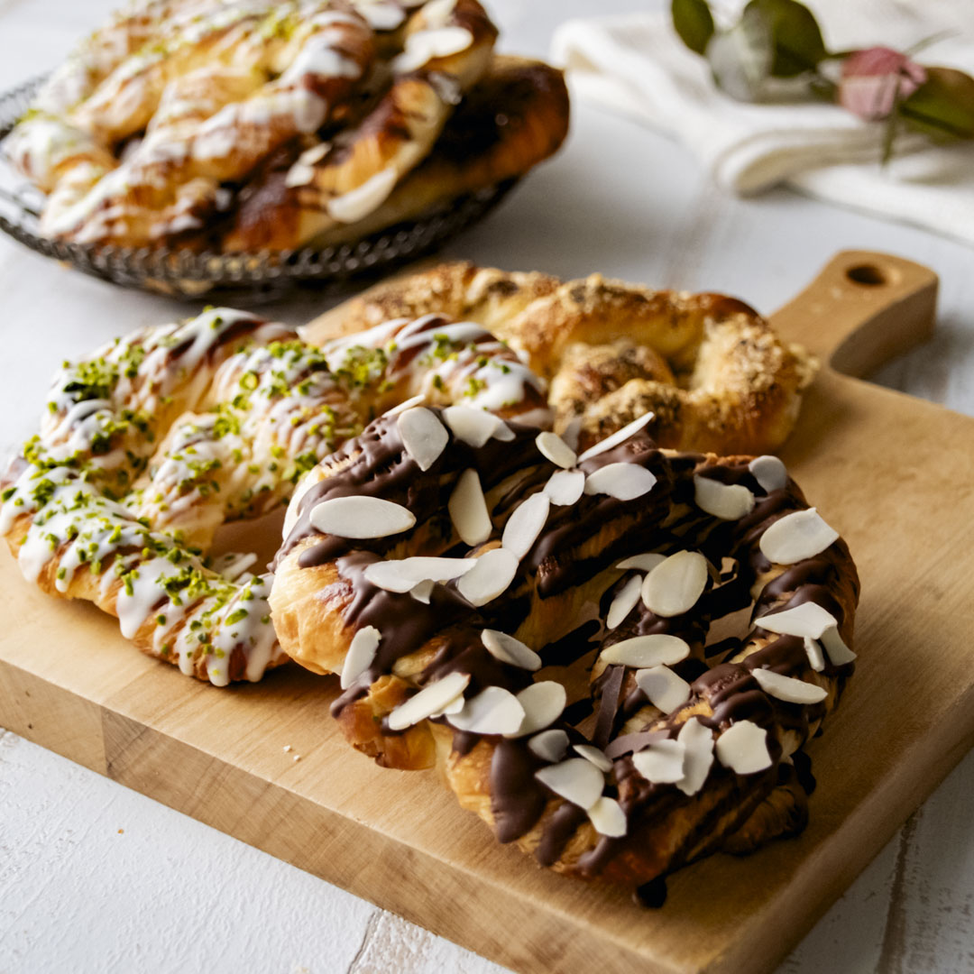 香ばしいメゾンカイザーを使用し、しっかりとオーバーナイトさせた熟成生地に、丁寧にバターを折りこんだデニッシュ生地から、さくさくと軽い食感が魅力のデニッシュプレッツエル3種を作ります。